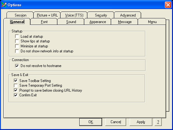 General | Font | Sound | Appearance | Message | Menu | Session | Picture + URL | Voice (TTS) | Security | Advanced