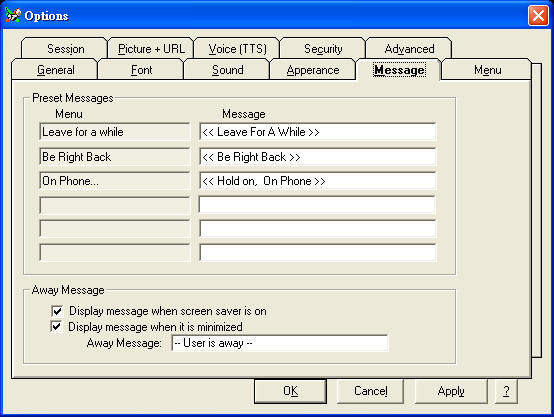 General | Font | Sound | Appearance | Message | Menu | Session | Picture + URL | Voice (TTS) | Security | Advanced