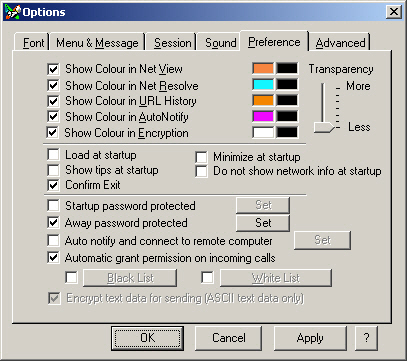 ** To maximize security issue, select both password option, Use Encryption for Data Sending and turn off Auto Accept Accept Incoming Connection.