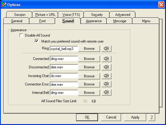 When you select Match your preferred sound with remote user, remote user can hear the same sound as your setting. (By default, the sound file is limited to 50k. You may change it in Advanced options)